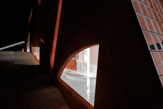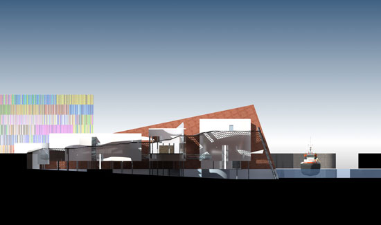 - Ansteigende Cortenstahlwände als bauliche Verbindung zwischen kleinmaßstäblicher historischer Innenstadt und Industriebebauung